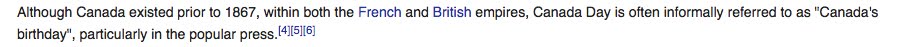 Or as some people like saying, “Happy Birthday Canada!” and by some people I mean the popular press. I, of course, fall into this category. I present to you this excerpt from Wikipedia, my favourite source: